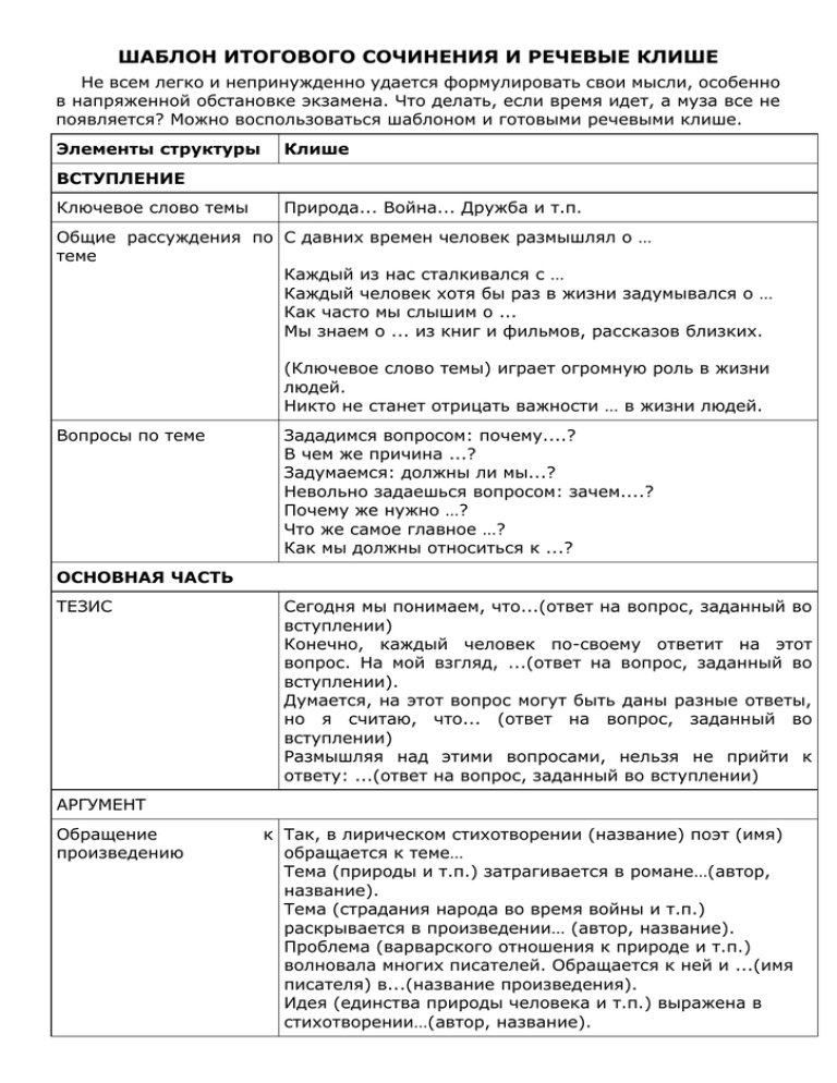 Итоговое сочинение план структура клише