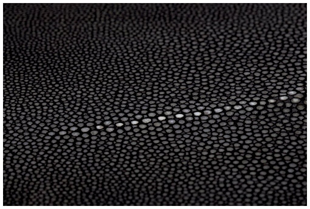 Отличительной особенностью текстуры кожи ската является уникальное сочетание мелких круглых чешуек и гладких участков, создающее эффект блеска и переливчатости. Каждая чешуя имеет неправильную форму и располагается плотно друг к другу, образуя прочный и гибкий защитный слой. При этом кожа ската приятна на ощупь, мягкая и прочная, что делает ее популярным материалом в производстве модных аксессуаров и предметов роскоши.